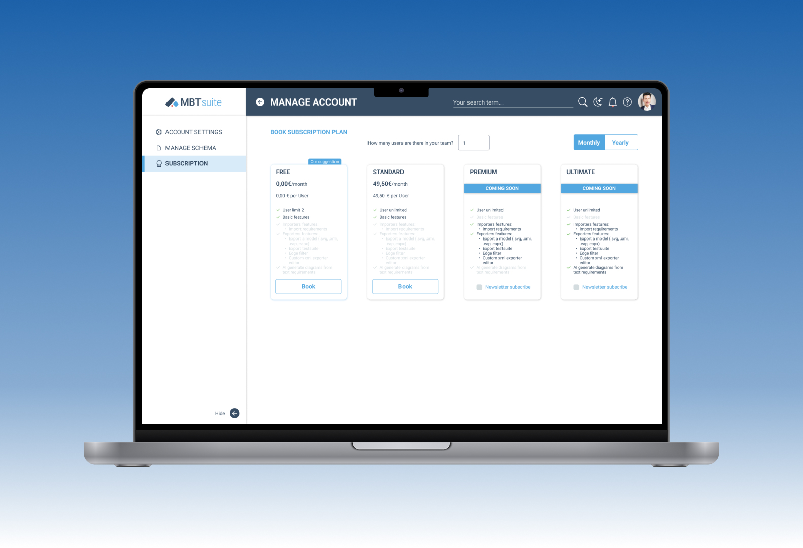 Das Abonnement-Management ermöglicht es dem Administrator, Informationen über die Benutzer und ihre Abonnements in einer anpassbaren Tabelle zu sehen. Benutzer können ein Abonnement wählen, das ihren Bedürfnissen entspricht, einschließlich kostenloser Optionen unter bestimmten Bedingungen.