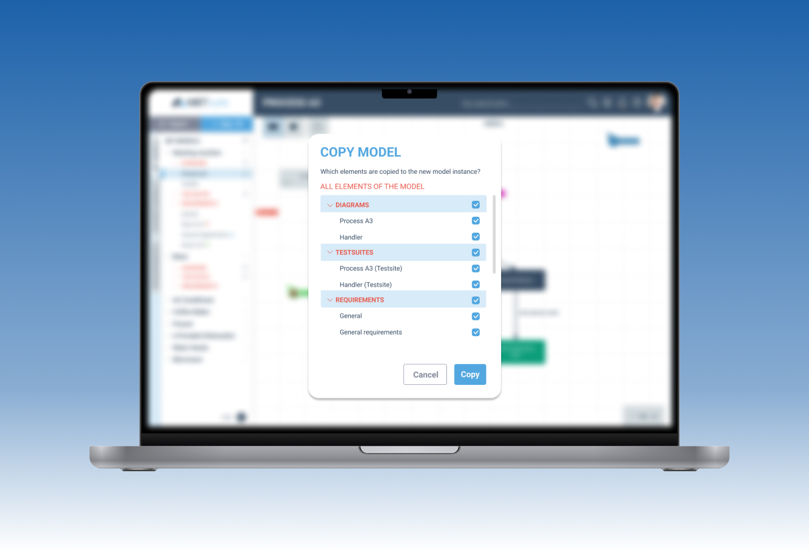 Ein Dialog wurde für das Kopieren von Modellen entwickelt, das es ermöglicht, Modellelemente mit Checkboxen auszuwählen. Standardmäßig sind alle Elemente ausgewählt, aber Benutzer können bestimmte Elemente von der Kopie ausschließen, wenn sie das Modell mit spezifischen Parametern oder Anforderungen kopieren möchten.