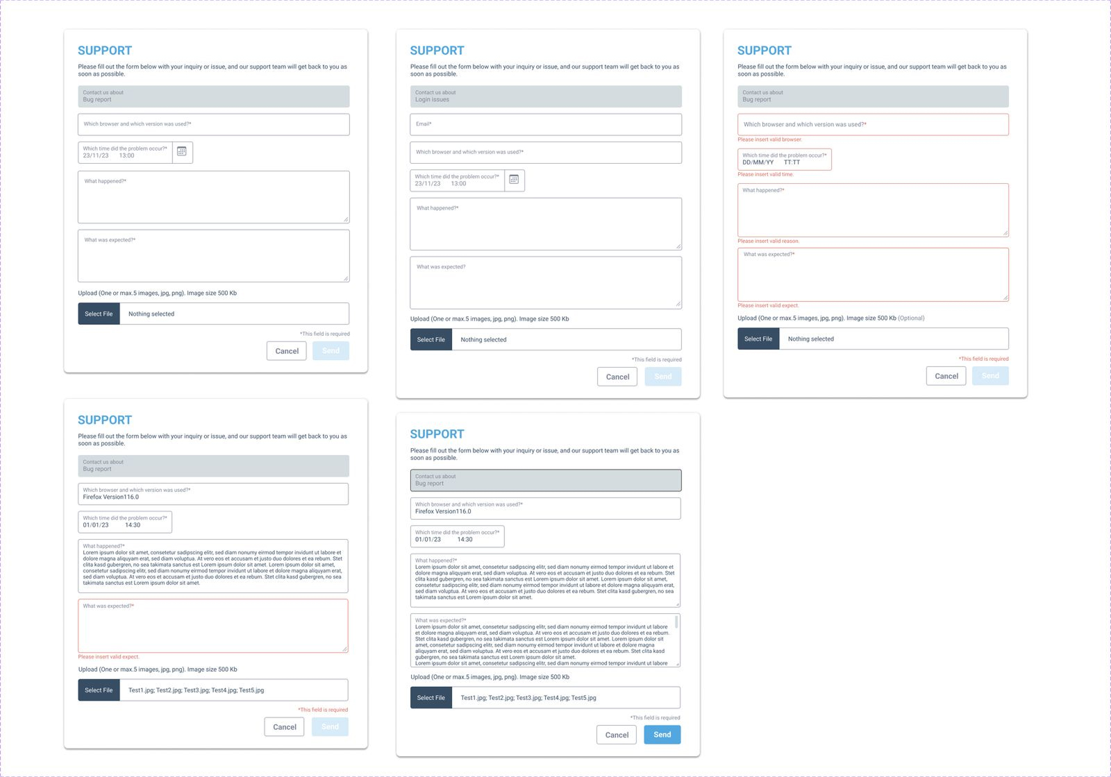 Das Support-Dialog steht Benutzern bei Problemen zur Verfügung. Sie können Details zu ihrem Problem, die verwendete Browserversion, den Zeitpunkt des Auftretens und die erwarteten Ergebnisse angeben. Unvollständige Felder müssen ausgefüllt werden, bevor die Nachricht gesendet werden kann.